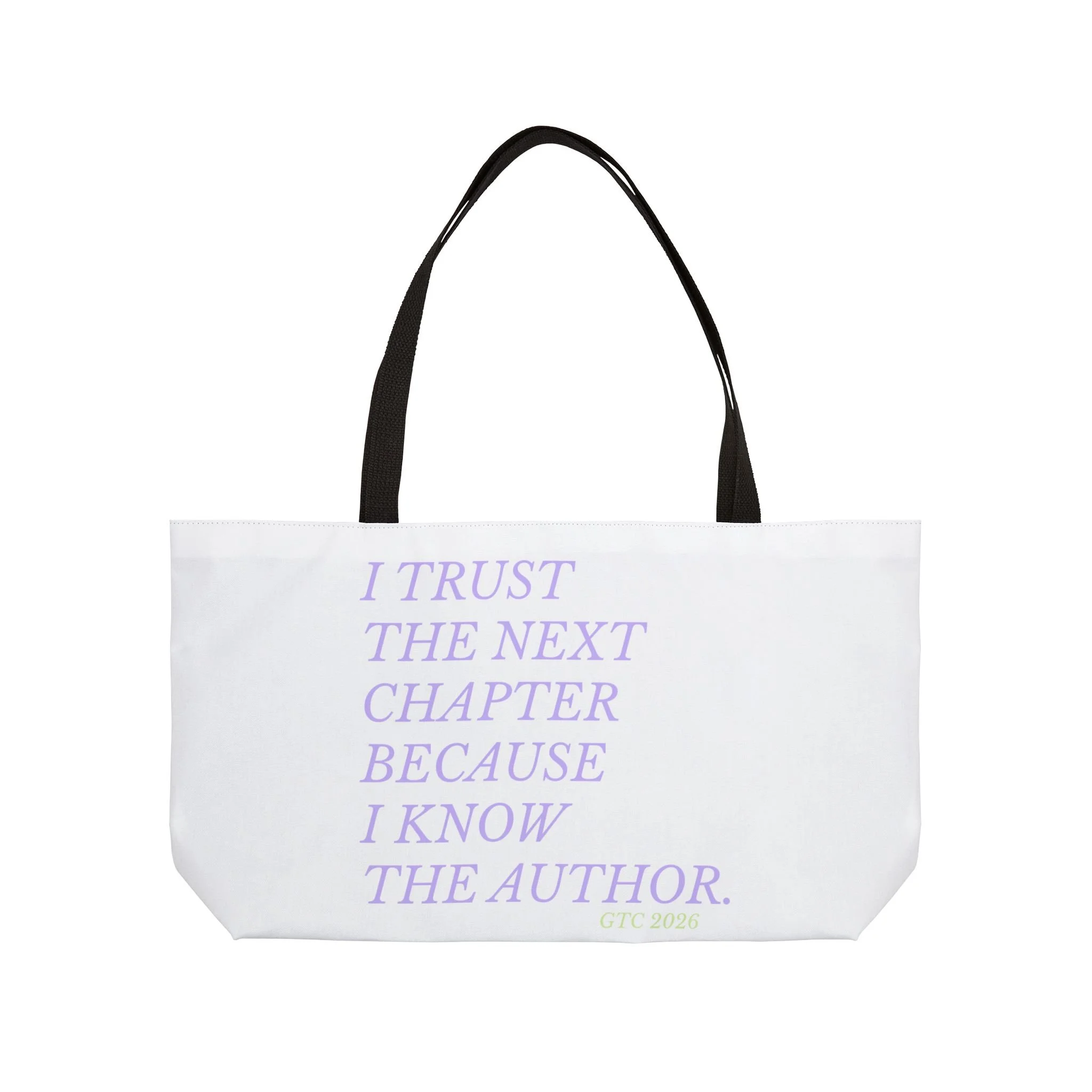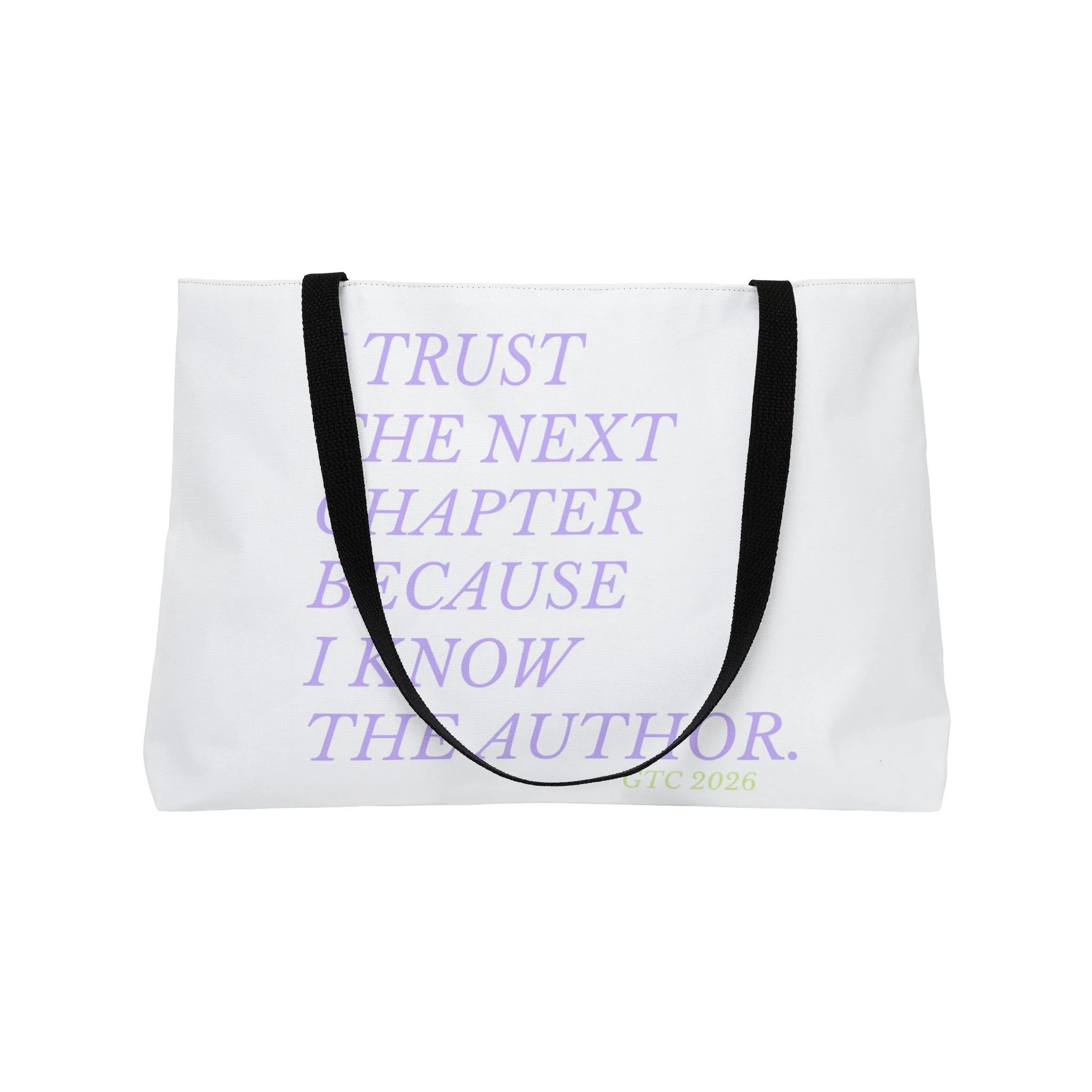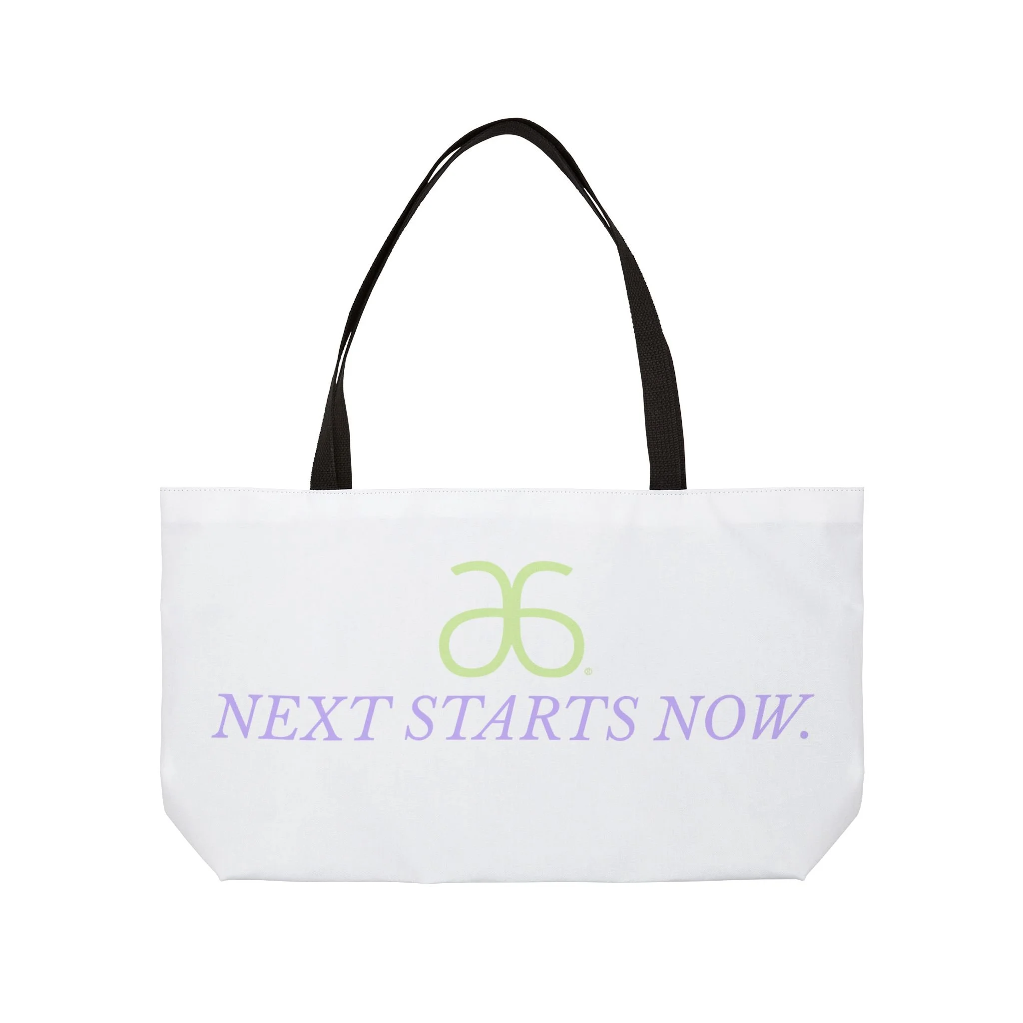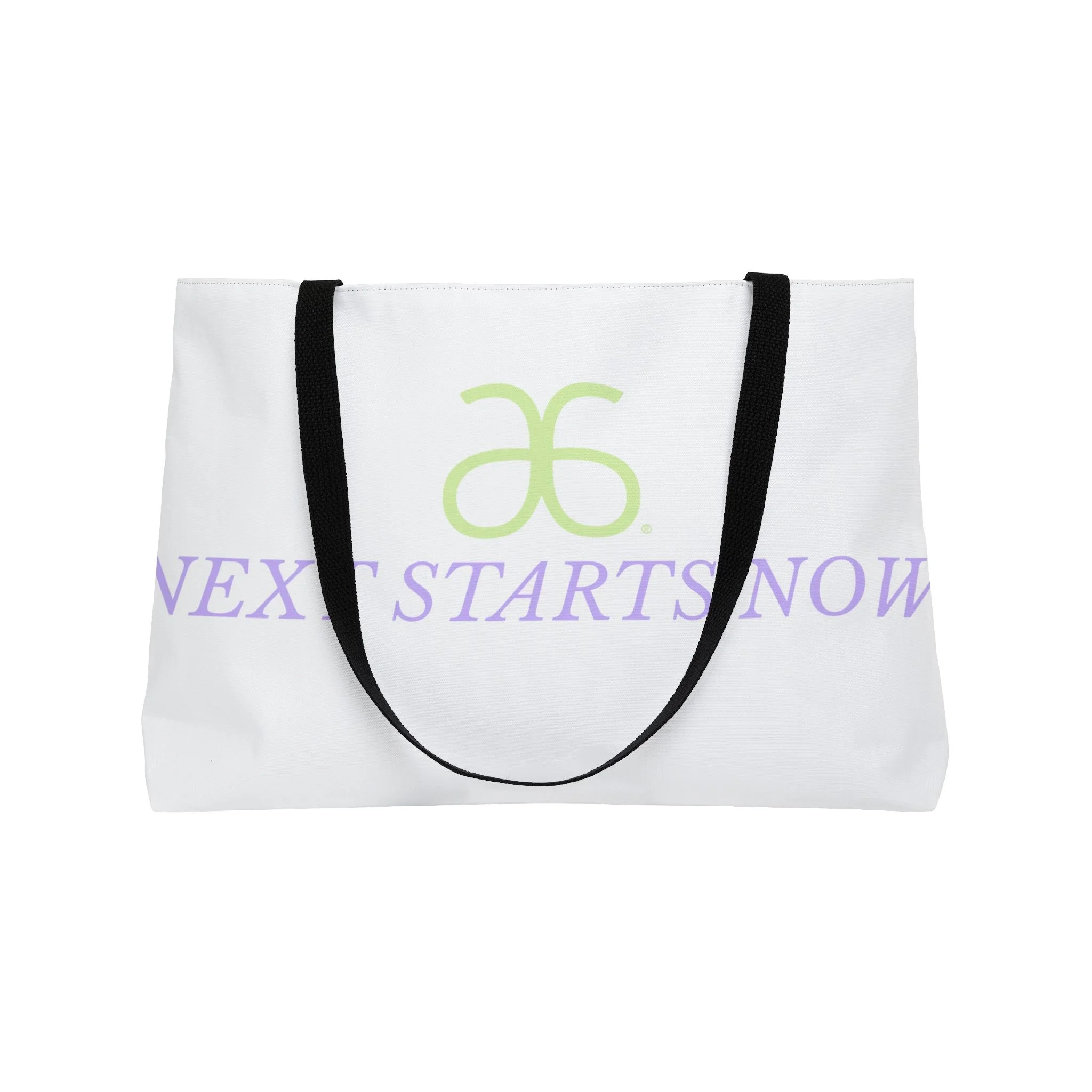 A roomy weekender tote made to carry the things that mark new beginnings — notebooks, a water bottle, a sweater and that stubborn stack of plans. The all-over white canvas showcases soft lavender text and a pale green emblem that reads like a quiet promise: “Next starts now.” Lightweight but structured, the T-bottom shape keeps the bag from collapsing while the black woven handles sit comfortably on the shoulder. It feels calm and intentional in hand, the kind of bag you grab when you’re heading to a planning session, a creative retreat, or a weekend that’s waiting to be written.